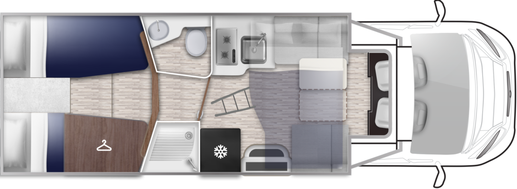 - Zadní lůžko: 2x 200x80 (možnost rozšíření 200x212) cm